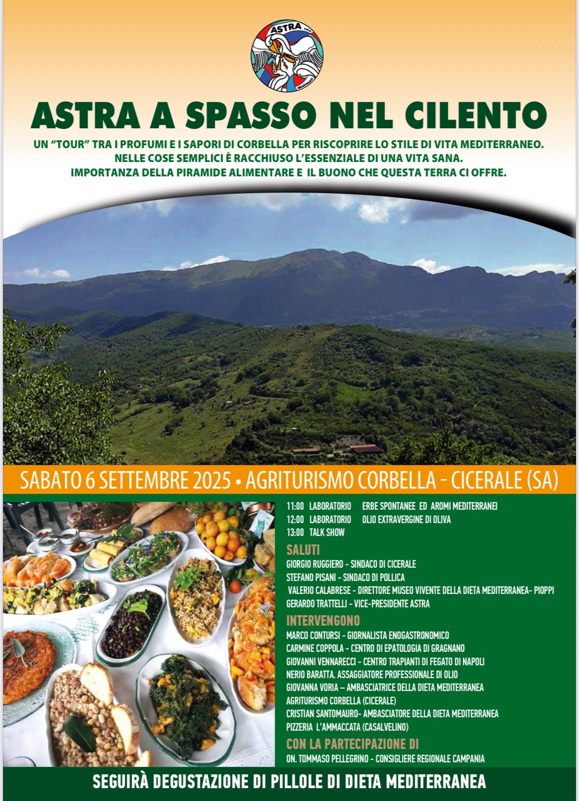 Il pranzo da Giovanna Voria, ambasciatrice della dieta mediterranea e titolare dell’agriturismo Corbella di Cicerale è stata l’occasione per far toccare con mano a medici e ai soci dell’Associazione Astra, che si può mangiare sano e di gusto, in un ambiente realmente bucolico, lontano da tutto ma vicino alla madre terra, al Cilento antico ed autentico, che molti confondono con quello caotico delle spiagge di agosto.