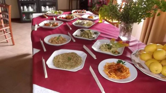E, naturalmente, il pezzo forte di tutta l’ospitalità è rappresentato dal menù dei tipici e saporiti piatti cilentani, preparati con cura e maestrìa dalla cuoca massimamente con i genuini prodotti dell’azienda, rivisitati nel rispetto delle antiche tradizioni locali ed annaffiati poi dall’ottimo vino locale. E così si possono gustare prelibate minestre come la pasta e fagioli; pasta con i ceci; pasta e fave; e poi pasta fresca tirata a mano come le cortecce ai fiori di zucca e zucchine; ed i fusilli al sugo di carne; ed ancora saporiti ortaggi e verdure imbottiti; così come le alici, preparate anche in versione fritte; mozzarella nella mortella, accompagnata da grigliate di melanzane e di zucchine; l’imperdibile ciambotta cilentana ricca di tutti i prodotti dell’orto; frittata con asparagi selvatici; piatti di carni rosse e bianche; e poi ancora squisiti dolci fatti in casa, come il classico cannolo cilentano e le crostate di frutta e poi spremute di agrumi a volontà. Insomma, non c’è che l’imbarazzo della scelta. Infine, cosa molto importante, i prezzi praticati qui sono molto convenienti.