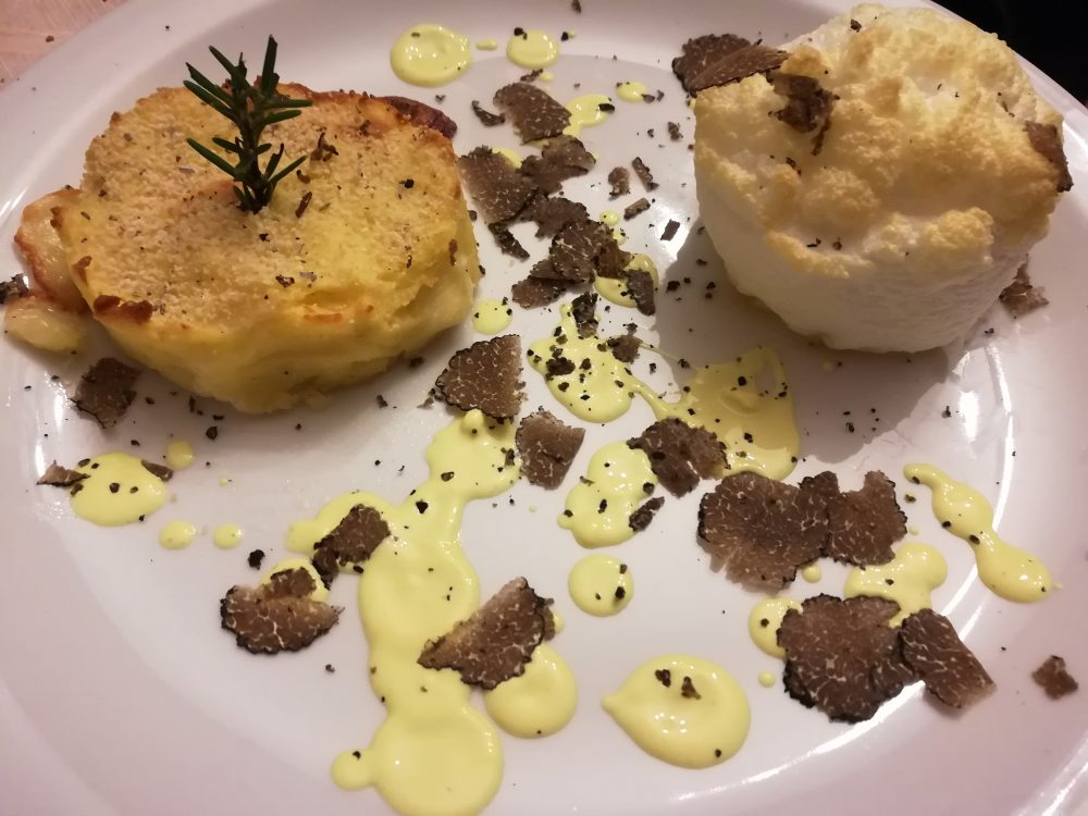 Per secondo ci viene portata una bella composizione con Uovo-Nuvola ripieno di Tartufo, Gattoncino di Patate e Provola, crema allo zafferano e le immancabili lamelle di Tartufo. E visto che c’è chi desidera un po’ di carne, veniamo accontentati con la succulenta e tenerissima Coppa di Maialino Nero di Faicchio alla brace cosparsa, manco a dirlo, di lamelle di Tartufo.