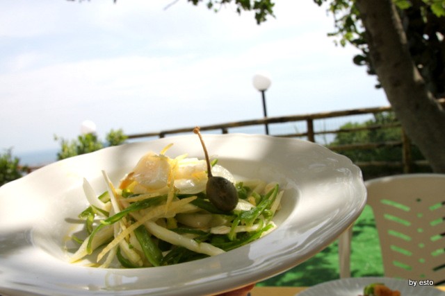 E si continua con una fresca insalata di baccalà con peperoncini verdi di fiume, finocchi e zeste di limone. Tutto a crudo.