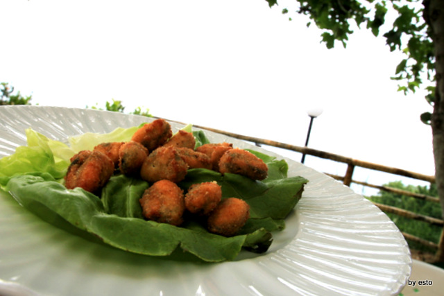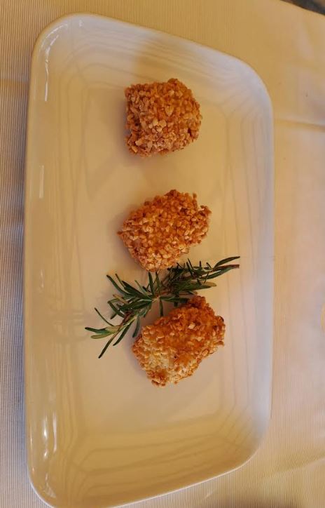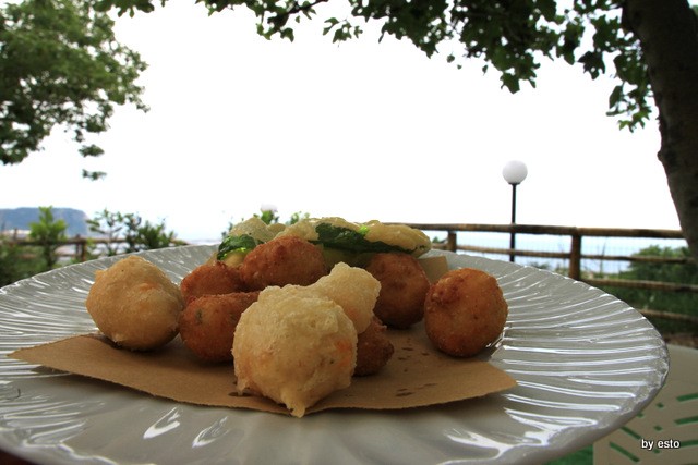 Il Gruccione -Baccala’, friarielli e papaccelle – polpettine con spuma di provolone e basilico fritto
