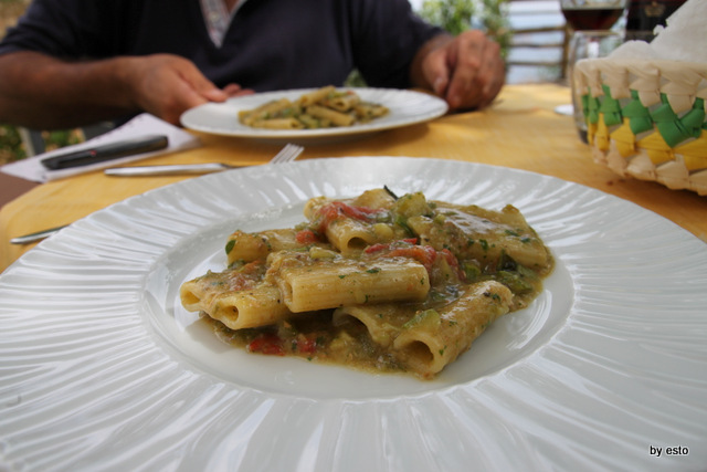 Paccheri con cozze e zucchine e riso con fiori di zucca e provola.