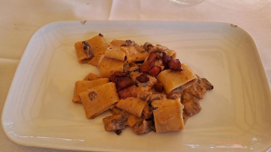 Il primo è un mezzo pacchero con stracciata di bufala e guanciale e il secondo, invece, un maialino in crosta di pistacchio con patate al forno. Tiramisù per dolce.
