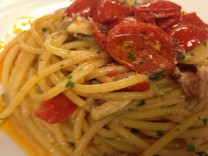 Tra le paste, citiamo lo spaghetto con pesto amalfitano, linguine con gli scampi, i ravioli di ricotta con fiori di zucca, gamberi e pinoli, le mafaldine di Gragnano con baccalà e piennolo.