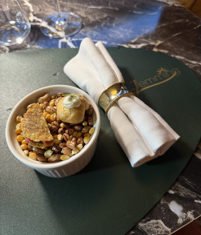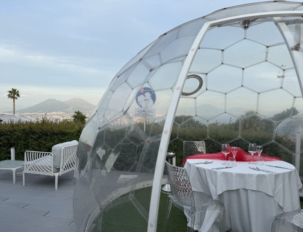 Al Jemming il panorama non è un semplice sfondo, ma parte integrante dell’esperienza. Da un lato il Vesuvio, maestoso e immobile come un antico guardiano; dall’altro Castel Sant’Elmo, che veglia dall’alto sulla città e sul mare. La vista spazia su Napoli in tutta la sua estensione, offrendo un colpo d’occhio che, al calar del sole, diventa quasi irreale. La luce del tramonto abbraccia la collina e accende ogni dettaglio: è in questo scenario sensazionale che il gusto incontra la meraviglia. La luce si rifrange sui vetri delle bubble room, vere bolle trasparenti dove si può cenare sospesi tra cielo e prato, avvolti dal silenzio e dall’incanto. Ogni tavolo sembra un palco, ogni bicchiere un riflesso dorato di orizzonte. Ed è proprio qui, dove è “obbligatorio baciarsi”, che il gusto diventa sentimento.
