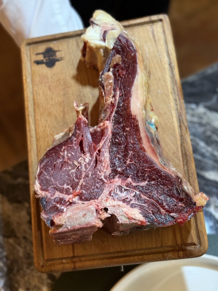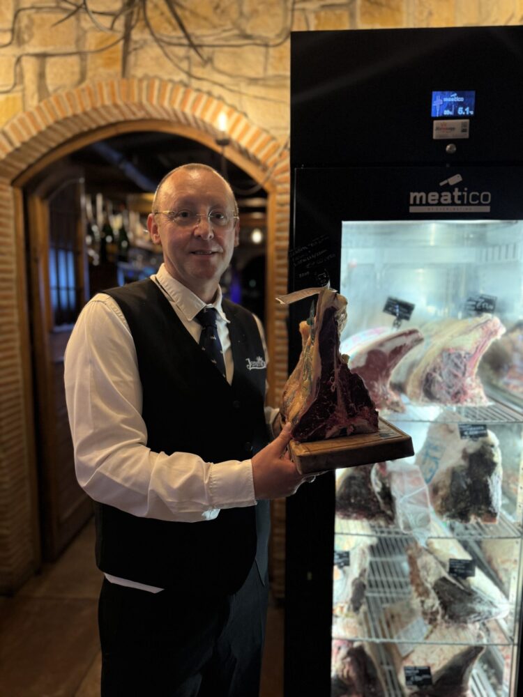 Poi arriva la protagonista assoluta: la carne iberica lombata frisona AS LUX Iberica. Frollata con cura, selezionata con rigore, servita da Mariolino – lo storico maître – con teatralità genuina. La sicurezza nei gesti, la complicità col fuoco e una cottura millimetrica fanno della carne un rito, un’emozione che si scioglie in bocca. Altro che Salt Bae: qui c’è sostanza vera.