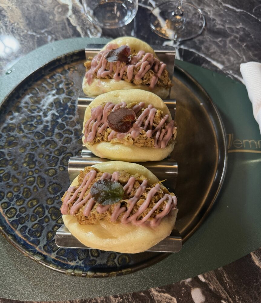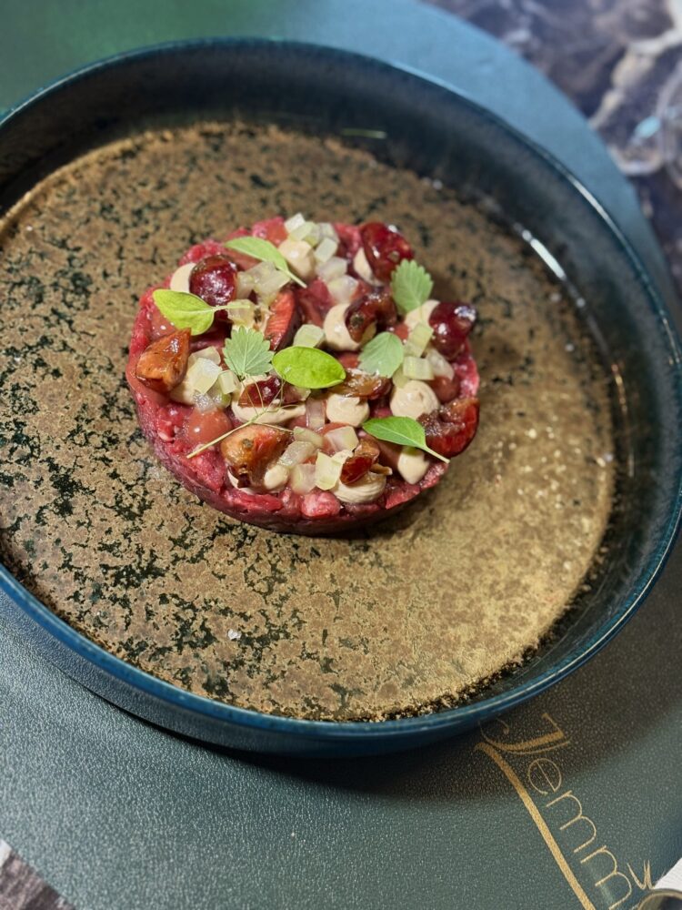 Segue un bao soffice che racchiude pancia di maiale speziata e salsa di mele: un boccone che è un abbraccio, dove l’Oriente sussurra alla Campania. Poi arriva Frutto Carnale, tartare di manzo con ciliegie in doppia consistenza, blu di capra ai mirtilli, brunoise di sedano. Un piatto audace, fruttato e sapido: il linguaggio del desiderio tradotto in gusto.