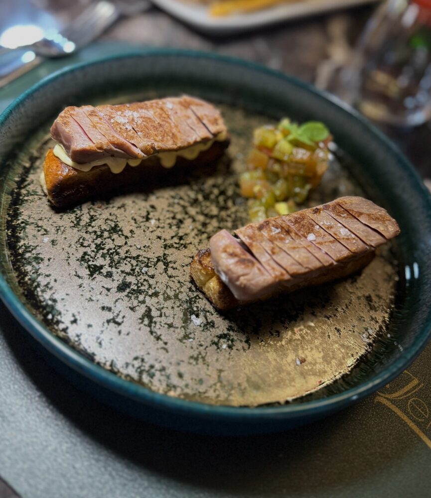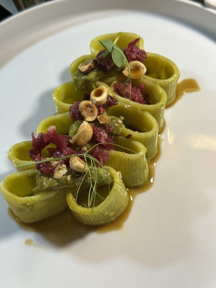 Internazionale è un french toast salato con controfiletto USA frollato 40 giorni, chimichurri montata, tartare di pomodoro cuore di bue: comfort food che ha studiato all’estero e ama la propria terra. Chiude il percorso con un primo Vaniglia e Terra: un piatto che rappresenta l’essenza del fine dining. I mezzi paccheri, disposti con armonia scultorea, accolgono una crema di asparagi profumata alla vaniglia che accarezza il palato. Il jus profondo si intreccia con la tartare di manzo cruda e delicata, mentre le nocciole tostate regalano croccantezza e calore. Un abbraccio tra orto e carne, tra dolcezza vegetale e profondità animale. Estetica, tecnica e gusto in perfetto equilibrio.