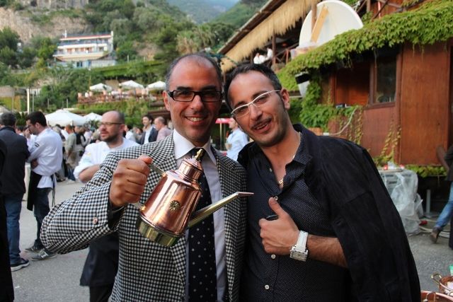 Manuel Lombardi scruta l’orizzonte pensando al suo Conciato Romano, mentre Antimo Caputo si diverte con il costruttore di ogliare.