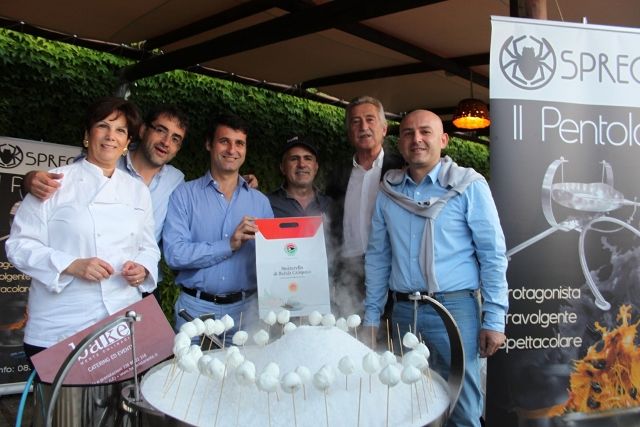 Antonio Lucisano Direttore del Consorzio Mozzarella di Bufala Campana Dop e Albert Sapere dellle Strade della Mozzarella stanno vicino al padellone cult di quest’anno: il Pentolo Sprech.