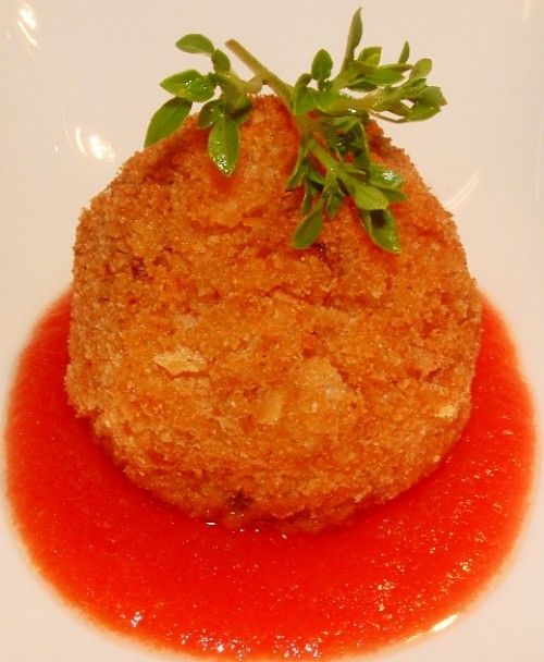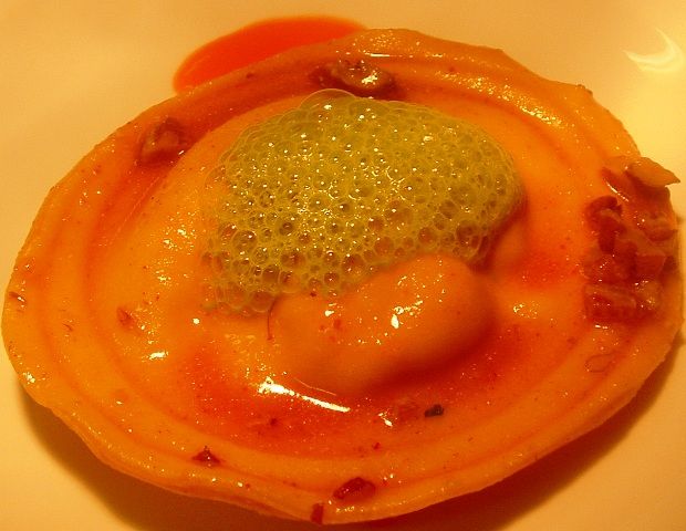 Mozzarella e pomodoro: gelato fritto di mozzarella di bufala su gazpacho di pomodoro, il grande classico della cucina italiana giocato su temperature diverse. Raviolo, mozzarella di bufala e gambero rosso di Mazzara del Vallo con colatura di alici, con la mozzarella ed il gambero crudo all’interno del raviolo.