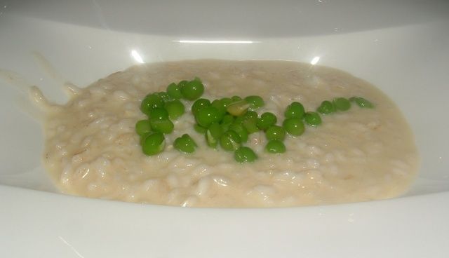 Riso carnaroli con elisir di mozzarella di bufala e piselli freschi dell’orto, si sente il gusto della bufala ma la bufala non c’è perché Giuseppe ha usato il liquido di governo per il risotto.