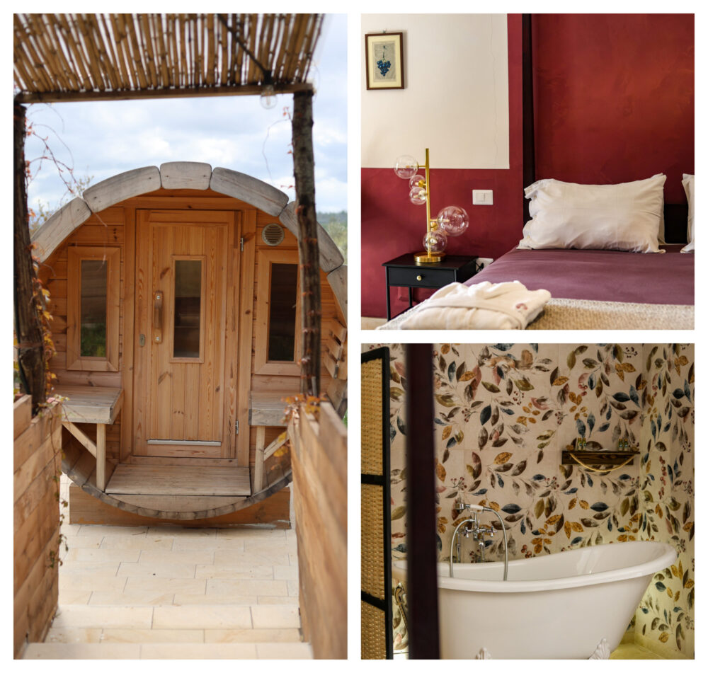 Le camere della struttura sono intime, eleganti, perfettamente inserite nel paesaggio rurale. Le suite, come la “Ulivi”, offrono spazi privati e materiali naturali, per un soggiorno in armonia con l’ambiente. La struttura è pet-friendly e propone esperienze all’aria aperta: