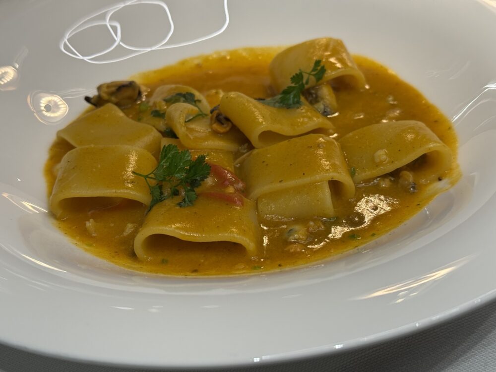 Il percorso è proseguito con ’a calamarata, interpretata con un equilibrio che richiama i profumi della primavera: pasta perfettamente al dente, una base dolce di zucca e la sapidità dei frutti di mare, in un piatto che unisce cremosità e slancio marino. In abbinamento è stato servito ancora Vigna Cigliano Solfatara, questa volta nell’annata 2020, che ha mostrato una personalità più evoluta: nel calice emergevano note leggere di tostatura, una sfumatura amaricante elegante e una maggiore complessità aromatica, segni di un’evoluzione interessante che dialogava perfettamente con la struttura del piatto.
