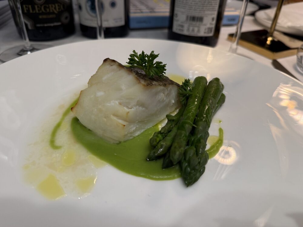Il secondo ha rappresentato uno dei momenti più convincenti della cena: baccalà tenerissimo con asparagi di campo, dove la delicatezza del pesce incontrava la freschezza vegetale e primaverile degli ortaggi.