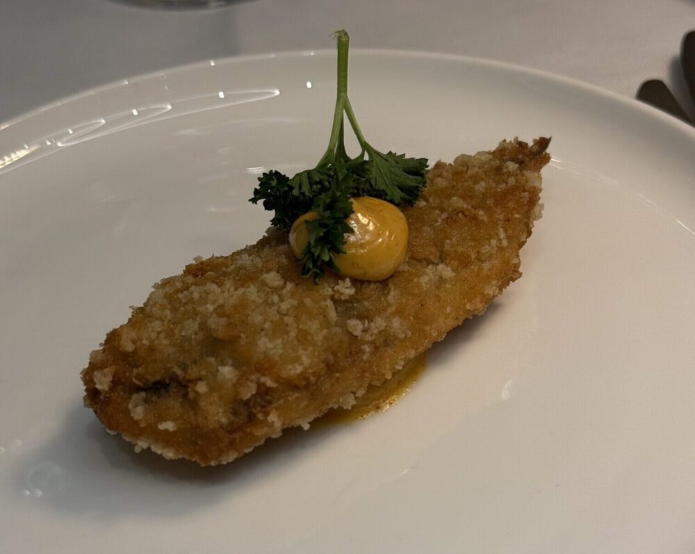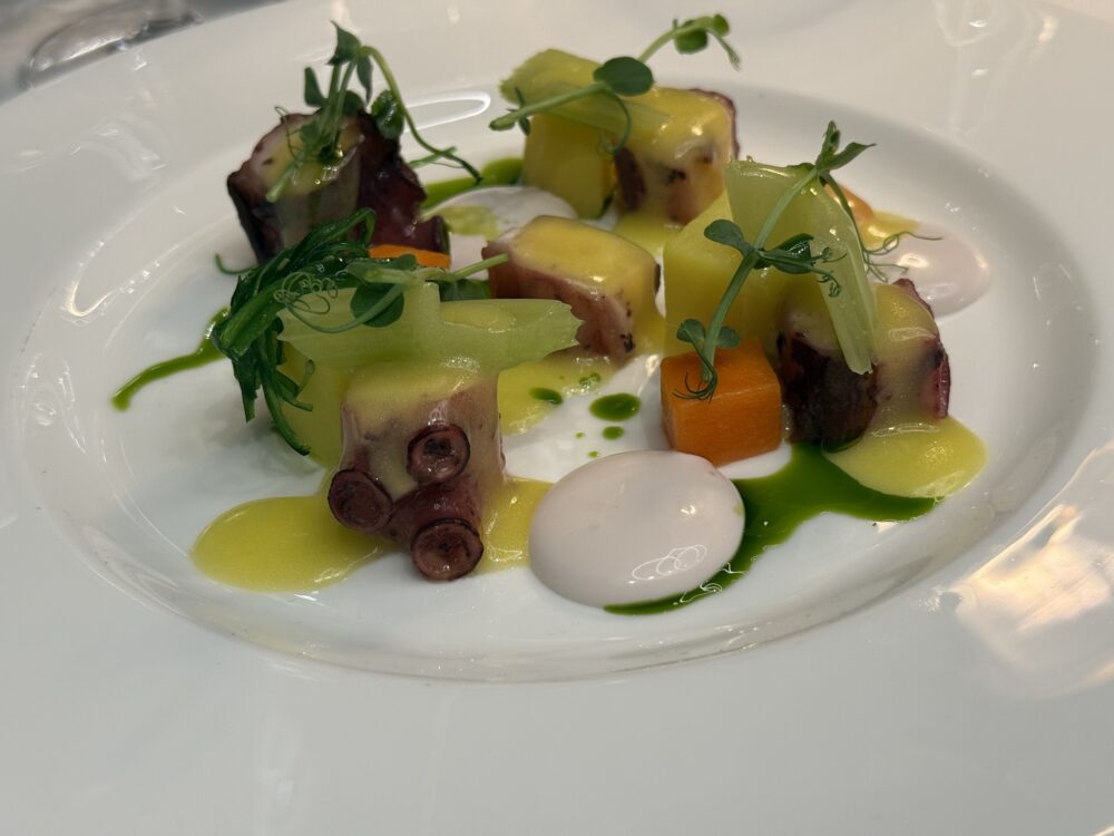 Dopo una fantasia dello chef come entrée, il menu si è aperto con ’o purpo se coce int’ all’acqua soja, polpo verace cotto nella propria acqua e accompagnato da verdurine di stagione. Un piatto essenziale e profondamente mediterraneo, abbinato al Campi Flegrei Bianco Vigna Cigliano Solfatara 2021, vino che esprime con chiarezza la tensione minerale dei suoli vulcanici flegrei. Fresco e verticale, il 2021 ha sostenuto con naturalezza la delicatezza del polpo e la componente vegetale del piatto.