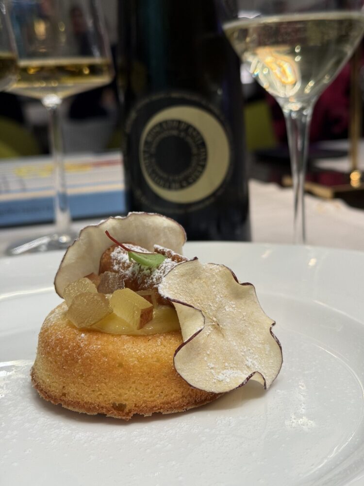 La chiusura è stata affidata al dessert Melizia ’e mela annurca, soffice e profumato, accompagnato dal Moscato d’Asti dei Vignaioli di Santo Stefano, vino aromatico e delicatamente dolce che ha concluso il percorso con leggerezza ed equilibrio.