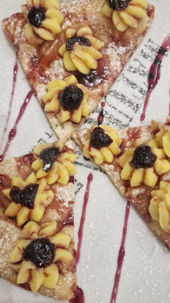 Trancio fritto e al forno, farcito con crema pasticciera e amarene sciroppate: la trasformazione di un dolce tipico del vesuviano in pizza.