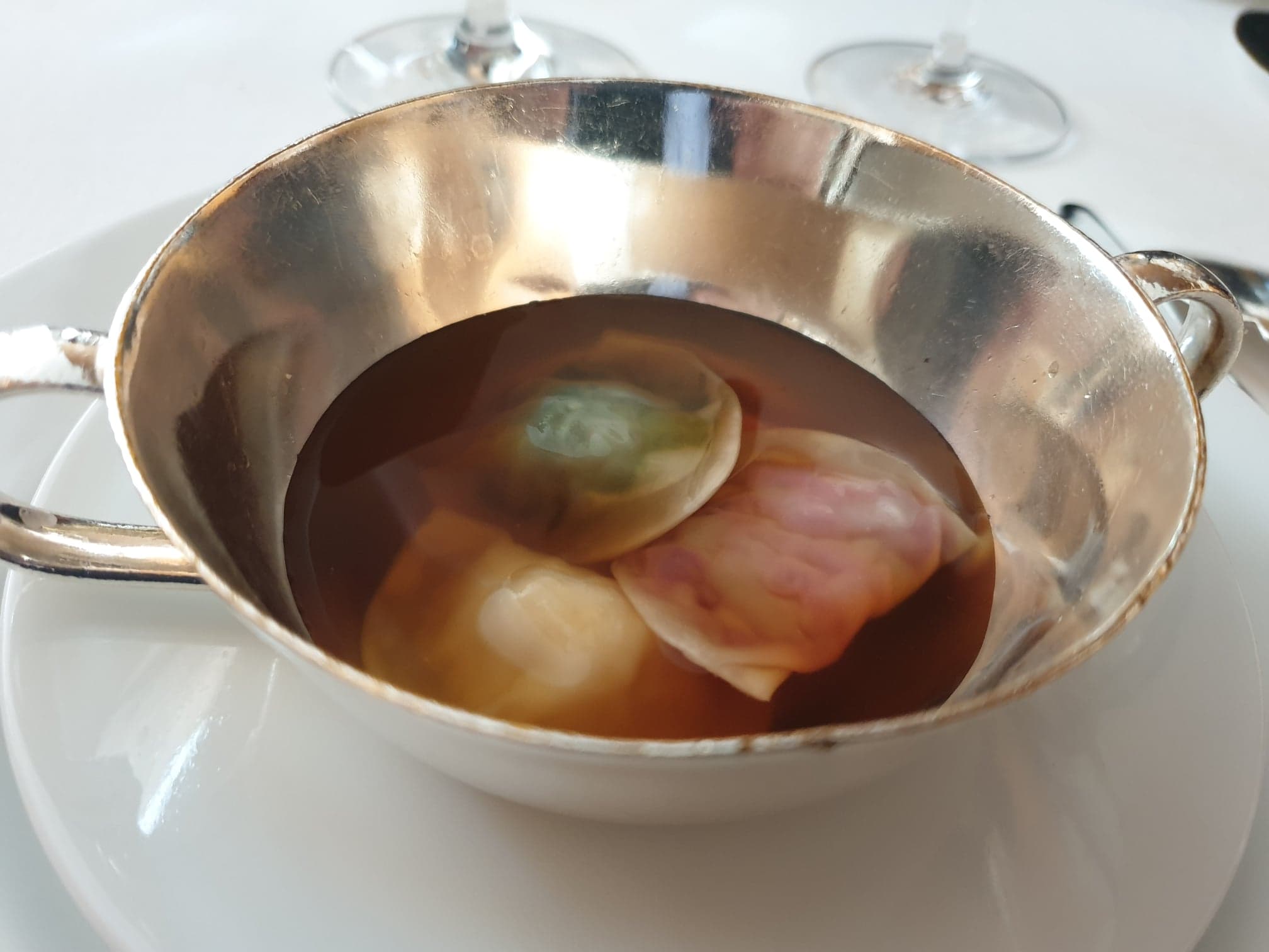 E così i piatti del cuoco francese, colorati, sgargianti, assemblati come quadri. Dal benvenuto si capisce che questa cucina mira ad esplorare a 360 gradi il mondo vegetale e tutte le sue potenzialità. Il Mesculun du potager du Gros Chesnay e pralin de pistache de Sicilie, è la versione primordiale dell’insalata 21 – 31 – 41 di Crippa, molto più golosa in questa versione, grazie ai condimenti con extravergine, salsa di pistacchio, arancia pelata a vivo, ed il parmigiano. La Trilogie de ravioles potagères au consomme ambrè è un piatto tanto bello, quanto buono, perchè esplora le note amaricanti delle verdure, appena mediate da una sottilissima sfoglia.