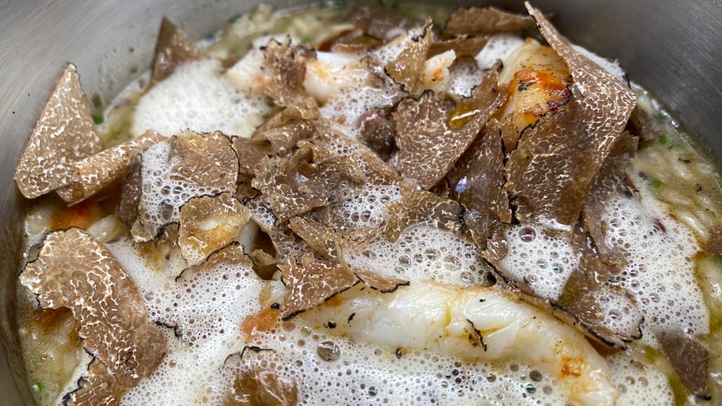 Il risotto con funghi, scampi, ricci di mare, cappesante alla brace e tartufo estivo