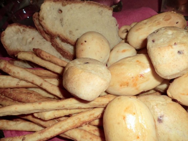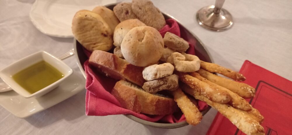 In tavola com’è costume in Puglia viene subito portato il cestino colmo di pane, grissini e taralli da intingere in una tazza di olio evo.