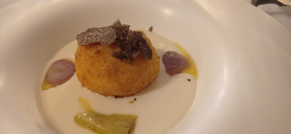 Per antipasto un delizioso uovo croccante, con fonduta di canestrato, lampascioni, carciofini e tartufo nero. L’uovo si scioglie voluttuosamente in bocca.