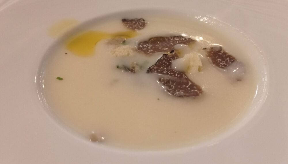 Come entrée ecco qui una squisita crema di patate, crostini di pane, funghi porcini e tartufo nero.