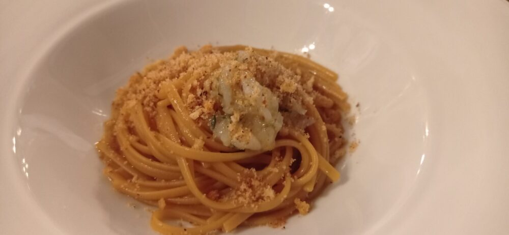 Per primo linguine, crema di gamberi, salsa di zafferano, gamberi rossi e formaggio dei poveri con gamberi. Piatto davvero eccellente.