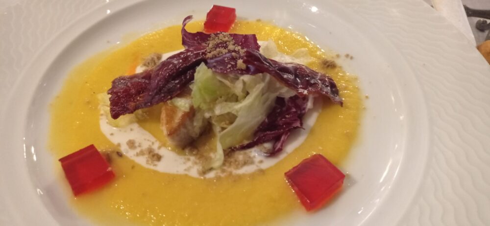 Per secondo la ricciola con salsa di datterini gialli, crema di burrata, peperoni cruschi, crumble di taralli integrali e gel al Campari. Piatto sublime e da incorniciare.