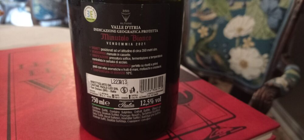 In accompagnamento ho scelto una bottiglia di Minutolo Bianco Valle d’Itria Igp 2021 dell’azienda Alture.