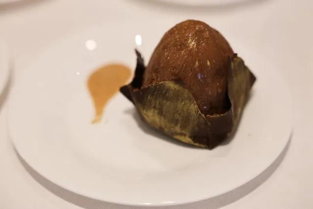 È invece il cioccolato il protagonista della proposta di Luca Borgioli, della Pasticceria Gabardina di Montemurlo, in provincia di Prato. Il suo Babà 13 21 è stato una dichiarazione d’intenti sin dal nome che indica i km (1321, appunto) che separano Napoli da Vienna e rappresenta una sintesi tra il Babà e la Sacher: un babà al cacao con gelée all’albicocca, ricoperto con glassa sacher e rifinito con cremoso fondente e caviale di albicocca, con il lievitato racchiuso in una sorta di scrigno di cioccolato.