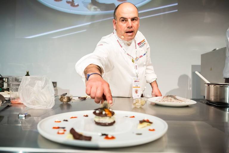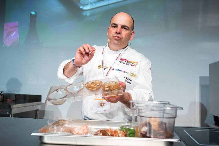 Quando Paolo Marchi, ideatore di Identità Golose, consegna il Premio atCARMEN Identità di Sala a Mariella Caputo della Taverna del Capitano cita il fratello Alfonso Caputo definendolo un pescatore prestato alla cucina. Non si sbaglia perché la pesca è la grande passione di Alfonso e durante il poco tempo libero è in barca che ama trascorrere qualche ora. Il tratto di mare su cui affaccia il suo ristorante è profondo e pescoso, ricco di biodiversità e di un pesce sapido e saporito come vi potrà capitare di mangiare qui oppure in Calabria, ad esempio al Gambero Rosso. Non stupisce che la lezione di Alfonso Caputo durante la terza giornata di identità golose nella sezione di Identità di Mare sia molto incentrata sui pesci che più ama: il polipo e la seppia. Originali gli spunti che ha proposto e che riflettono pienamente la sua personale idea di cucina.