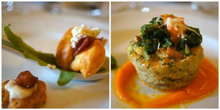 I piatti portati in tavola sono quelli in carta di questa stagione. In apertura è stato servito l'antipasto composto da assaggi finger food: il babà rustico farcito con ricotta di bufala e salame di bufalo, il biscotto con crema al conciato romano e pera candita. A seguire, il fior di zucca ripieno in pastella, il pane alle erbe aromatiche condito con melanzane in agrodolce, il pomodorino del piennolo farcito, lo strudel rustico con broccoli, salsiccia di suino nero razza casertana e mozzarella di bufala campana dop affumicata, la polpetta di melanzane ed ancora, il soufflé di patate su crema di zucca accompagnato con foglie di zucchine stufate. Qui la cuoca californiana ha affermato di non aver mai cucinato nel suo ristorante le foglie di zucchine che trova molto interessanti.