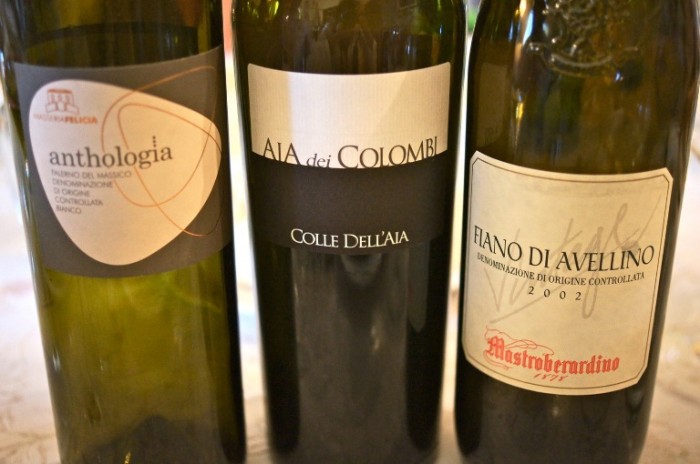 I vini in abbinamento: Falerno del Massico bianco di Masseria Felicia, Fiano di Avellino e Taurasi di Mastroberardino, Aglianico Aia dei Colombi della famiglia Pascale, tutte etichette di annata che hanno entusiasmato ed accarezzato il palato della grande Alice Waters.
