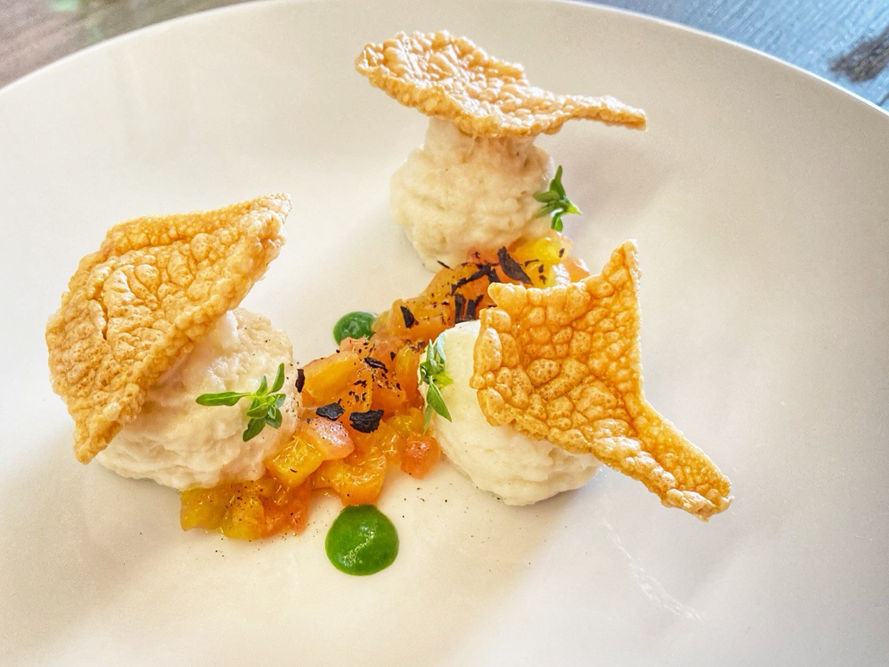 Qui, l’amaro della spezia e l’aroma iodato del frutto di mare, bene si accompagnano, mentre la grassezza della panna acida e la dolcezza della capasanta, reggono il tutto.