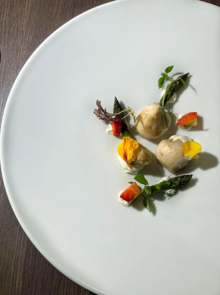 Tra gli antipasti, colpiscono le capesante scottate con panna acida, fragole, punte di asparagi e salsa al dragoncello.