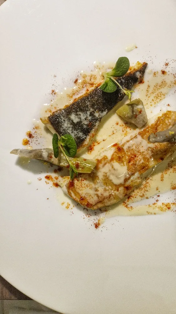 Tra i secondi, rombo scottato con il suo fondo al cioccolato bianco, carciofi e pimenton.