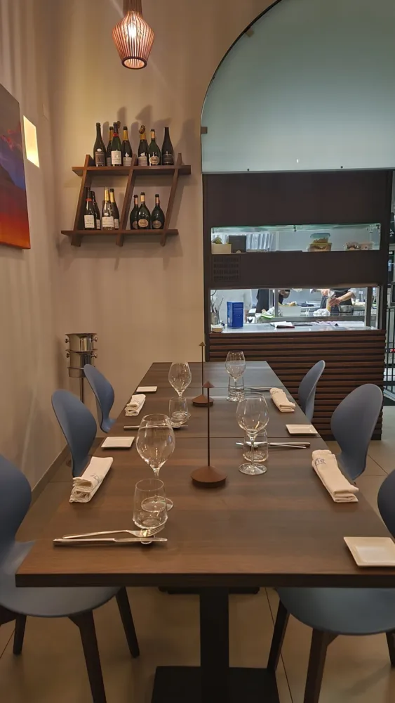 Il locale è elegante come ti aspetti, minimal nella mise en place con 40 posti a sedere tra interno ed esterno ed un piccola saletta riservata ad una eventuale chef’s table.