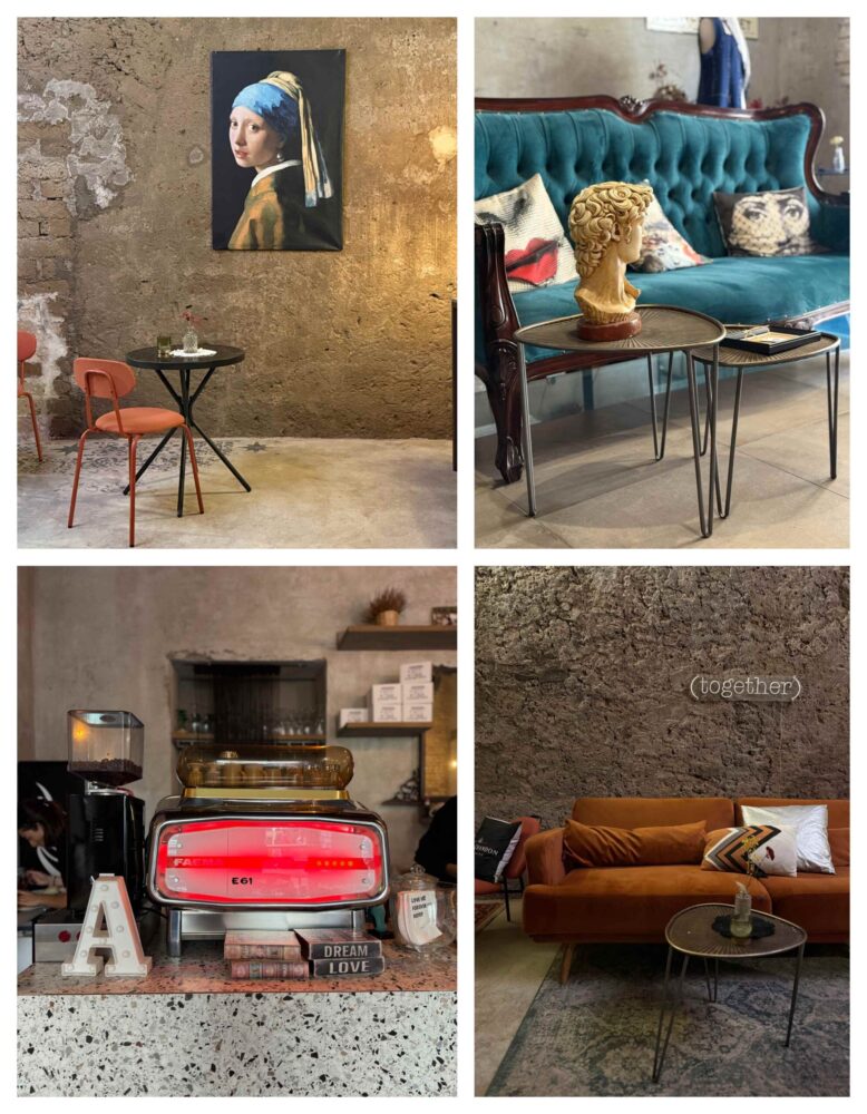 L’ingresso introduce subito il carattere del progetto: una porta in ferro battuto apre a un interno industriale elegante, fatto di pareti essenziali, superfici pulite e luce calda. È un’estetica urbana, moderna, che richiama le grandi capitali europee, pur mantenendo una morbidezza mediterranea che rende l’ambiente accogliente e mai impersonale. Oltre la sala principale, il locale si distende in piccoli living e zone raccolte, pensate per studiare, lavorare, incontrarsi o semplicemente fermarsi più del previsto. Uno spazio progettato per essere vissuto, non attraversato.