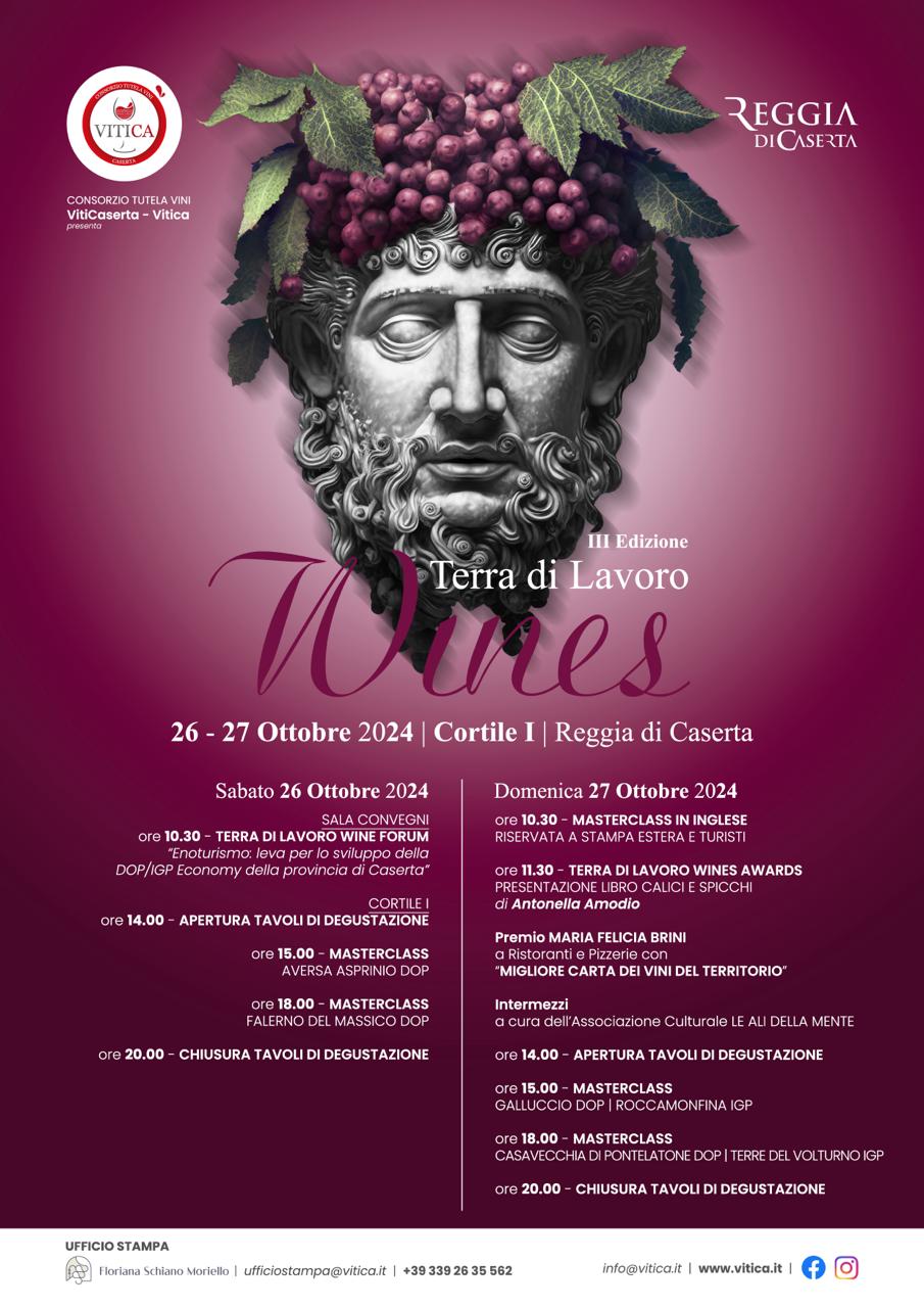 Programma generale TDL wines III ed 16/10/2024 Torna a: Alla Reggia di Caserta, Sito Unesco, “TERRA DI LAVORO WINES”: Appuntamento 26 e 27 Ottobre 2024 Programma generale← PrecedenteSuccessiva →