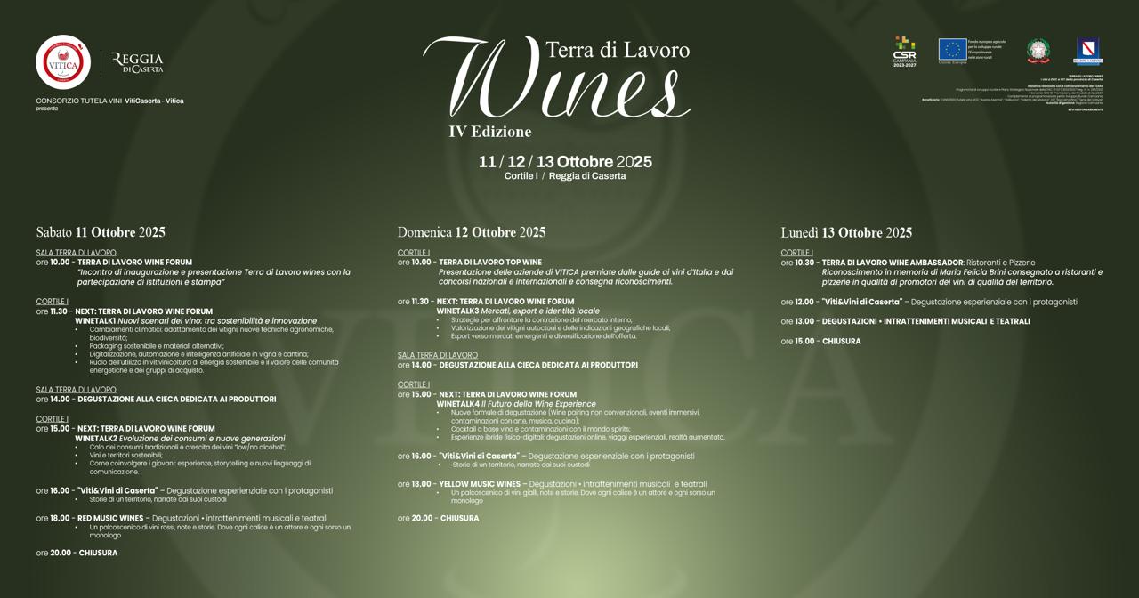 TDLwines 25- programma generale 26/9/2025 Torna a: Alla Reggia di Caserta, Sito Unesco, “TERRA DI LAVORO WINES” si celebrano le denominazioni vitivinicole tutelate dal Consorzio Tutela vini Caserta – VITICA Vitica← Precedente
