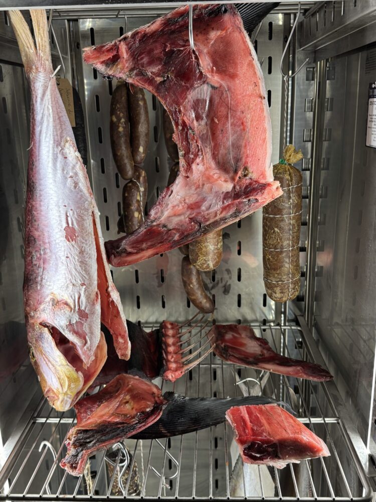 La frollatura risale a galla da un fondale di esperienza, tecnica e studio: “L’avvicinamento al mondo della frollatura è stato graduale, dalla lettura di libri. Il primo è stato Jacopo Ticchi, sui social poi con Josh Nilland, ho conosciuto personalmente Massimo Nobili poi Francesco Sodano. Cerco di far frollare tutto in modi diversi e mi piace arrivare alla fine del processo per scoprire il risultato finale”.