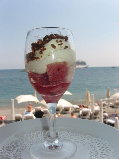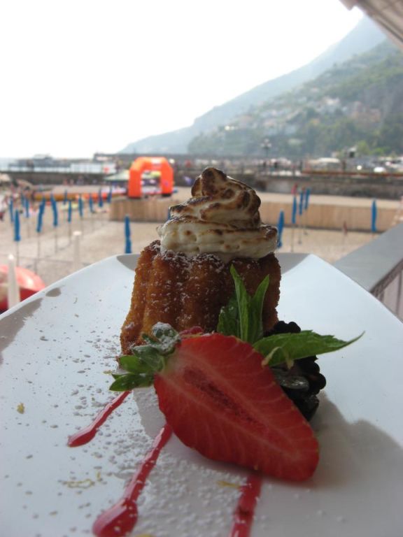 La sapienza marinara di questi luoghi poi impone che i pesci nobili vengano appena scottati e goduti quasi in purezza: pezzogna scottata con pomodori Sorrento e fagiolini. Ci avvia alla dolcezza il pre dessert di pan di spagna ed amarene, seguito dalla zuppa di fragole e frutti di bosco al prosecco.