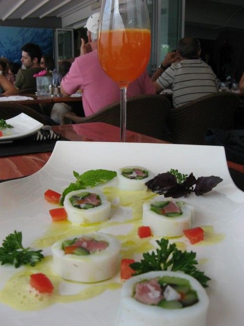 Sushi di calamaro all’alga marina e maionese all’olio evo. Con cocktail Amalfi Sunset (agli agrumi della costiera)