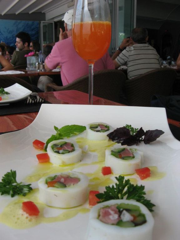 I piatti propongono una cucina di forte impronta mediterranea e protagonista incontrastato è il pescato della costiera ed il profumo degli agrumi che ritroviamo in più preparazioni. Il benvenuto ci è dato dal gambero in tempura al nero di seppia su zucchine alla scapece. Giampaolo ama divertire i propri ospiti e propone in abbinamento il cocktail Kiwi Flower, una sferzata di piacevole freschezza all’aroma di kiwi e lime. In antipasto il sushi di calamaro all’alga marina e maionese all’olio evo: delicato,divertente e gustosissimo.