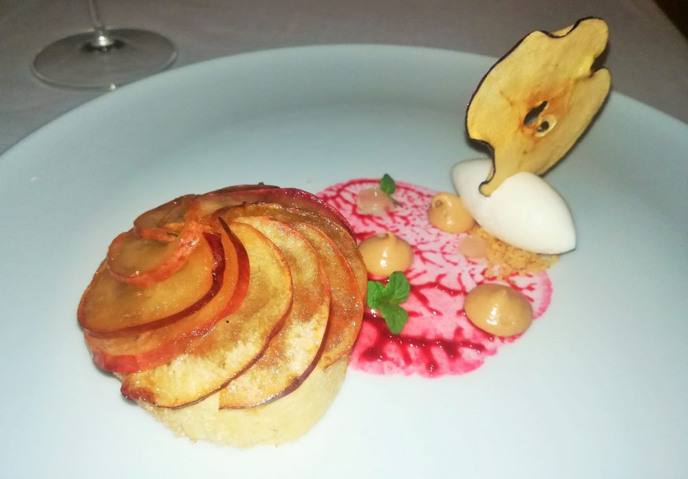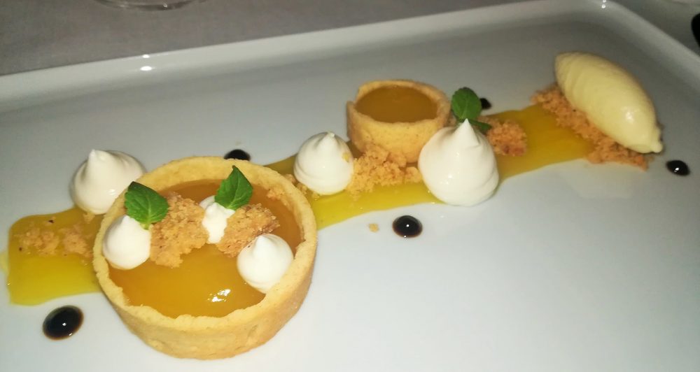 Scegliamo “il mandarino”, con tartellette ripiene di salsa al mandarino, mousse di burrata, noci e gelato al latte di soia e “la mela annurca”, con un tortino caldo di nocciole, frutti rossi e gelato affumicato alla vaniglia.