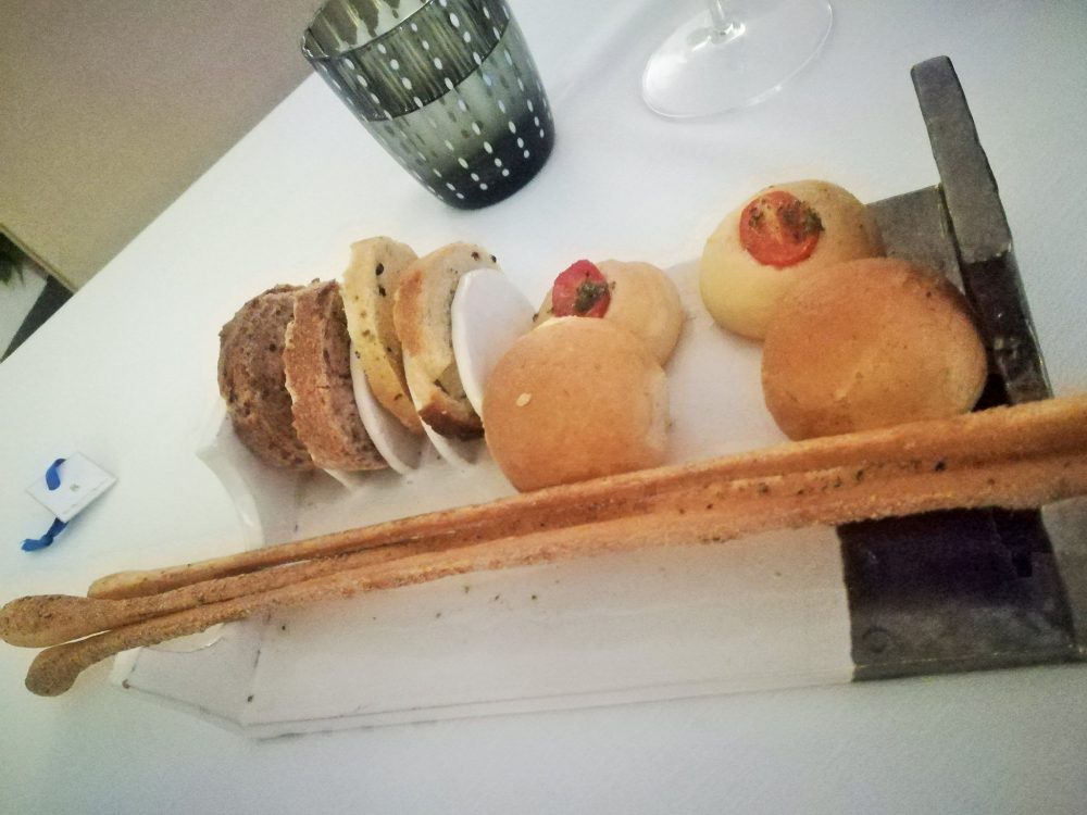 Per iniziare, una selezione di pane servita in un piatto in ceramica studiato apposta per i diversi formati presentati: i grissini, il pane alle olive, il pane ai cereali, le focaccine con i pomodorini e i panini con friarielli disidratati, tutti fragranti e ben lievitati.
