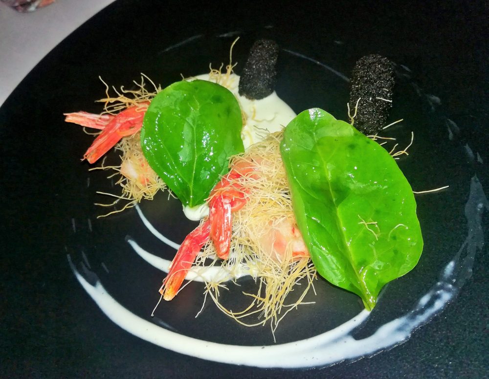 Come antipasto scegliamo i gamberi in pasta kataifi su salsa di patate al limone con spinaci e piccole crocchè all’aglio nero, nell’insieme croccante e gradevole.