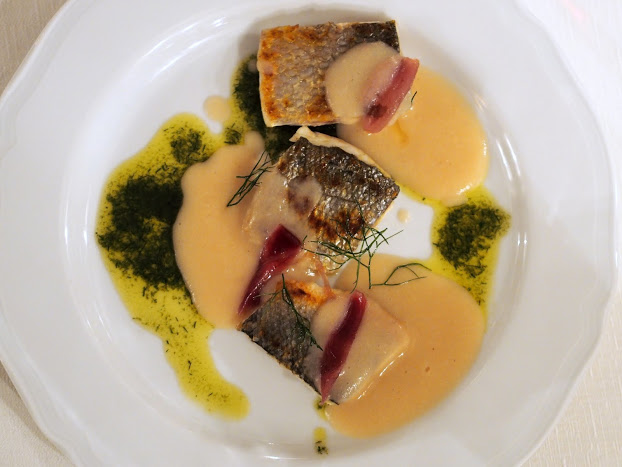 Crema di fagioli cannellini e aglio sbianchito, bocconcini di pesce al lemongrass e cipolla caramellata