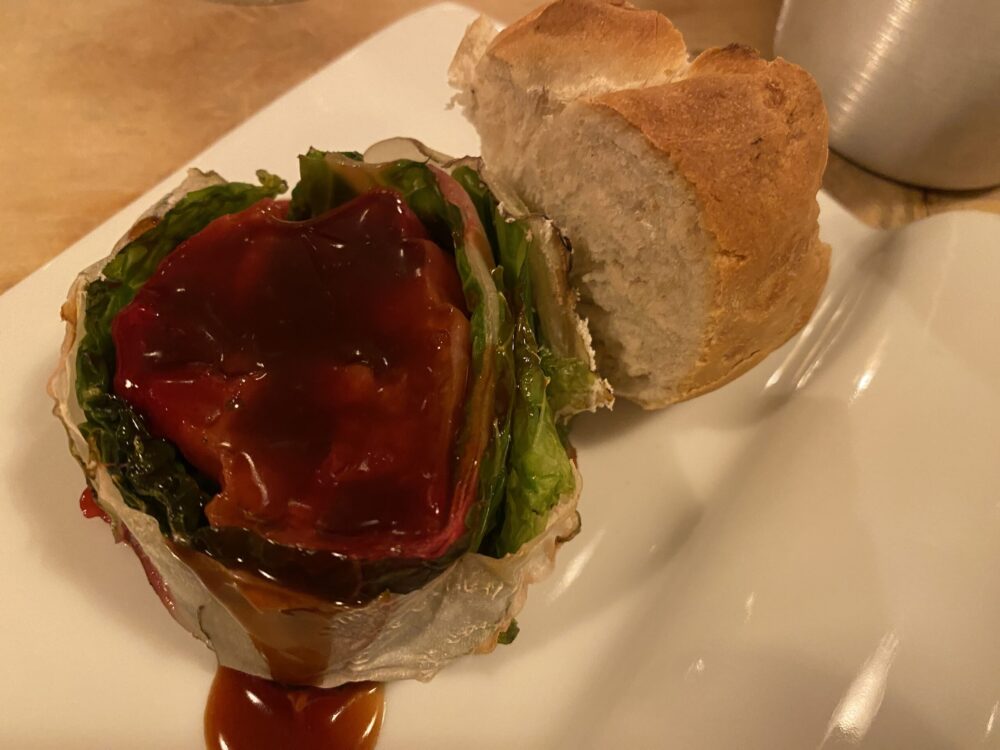 C’è anche spazio per la rivisitazione in chiave veg di un piatto tradizionale della montagna valtellinese, il “Borsat”: sacca di vello di pecora farcita con pezzi di carne dell’animale. Un piatto povero della pastorizia locale, qui rivisto con la rapa rossa e le erbe di montagna al posto della pecora. Tutta un’altra cosa.